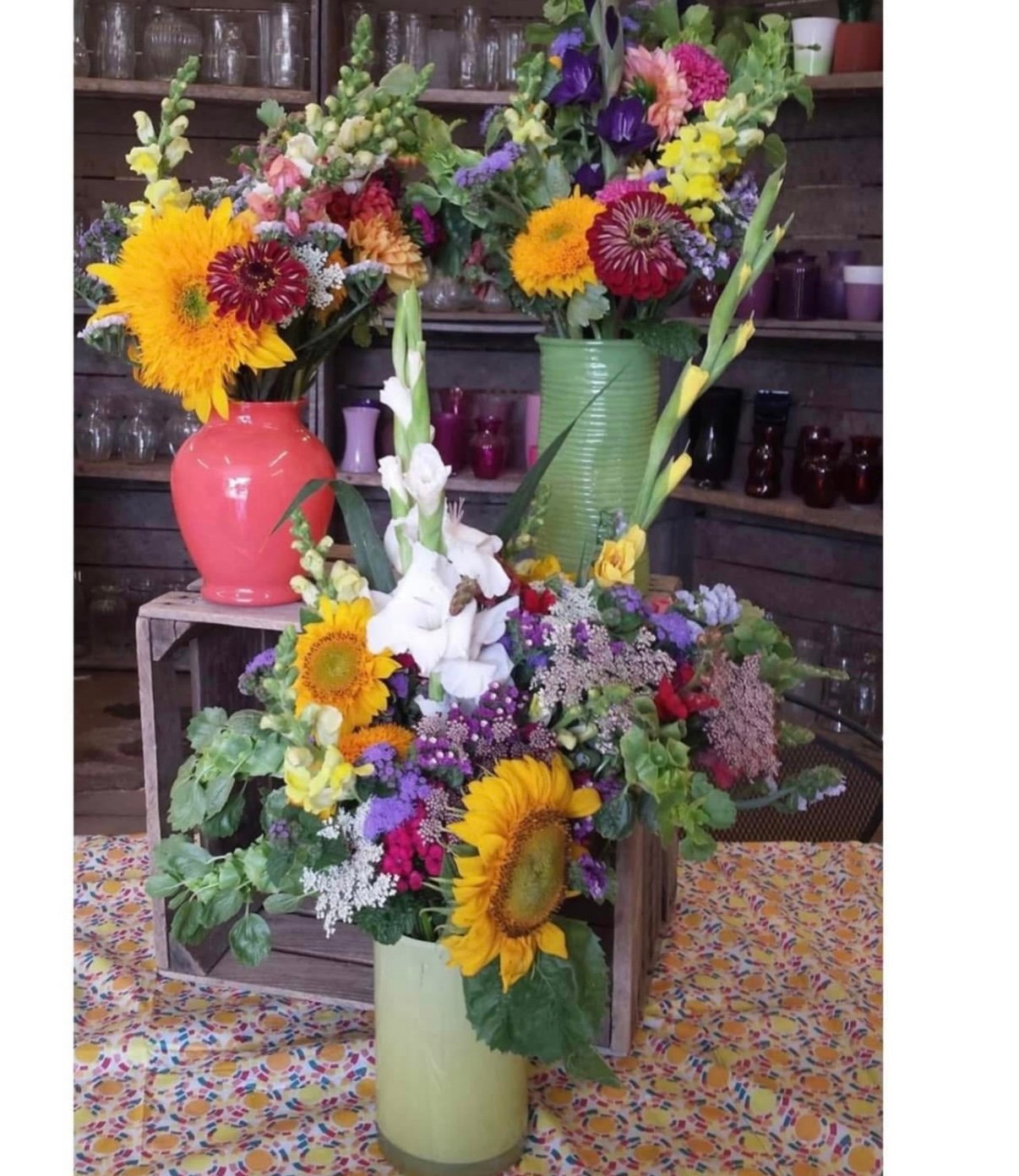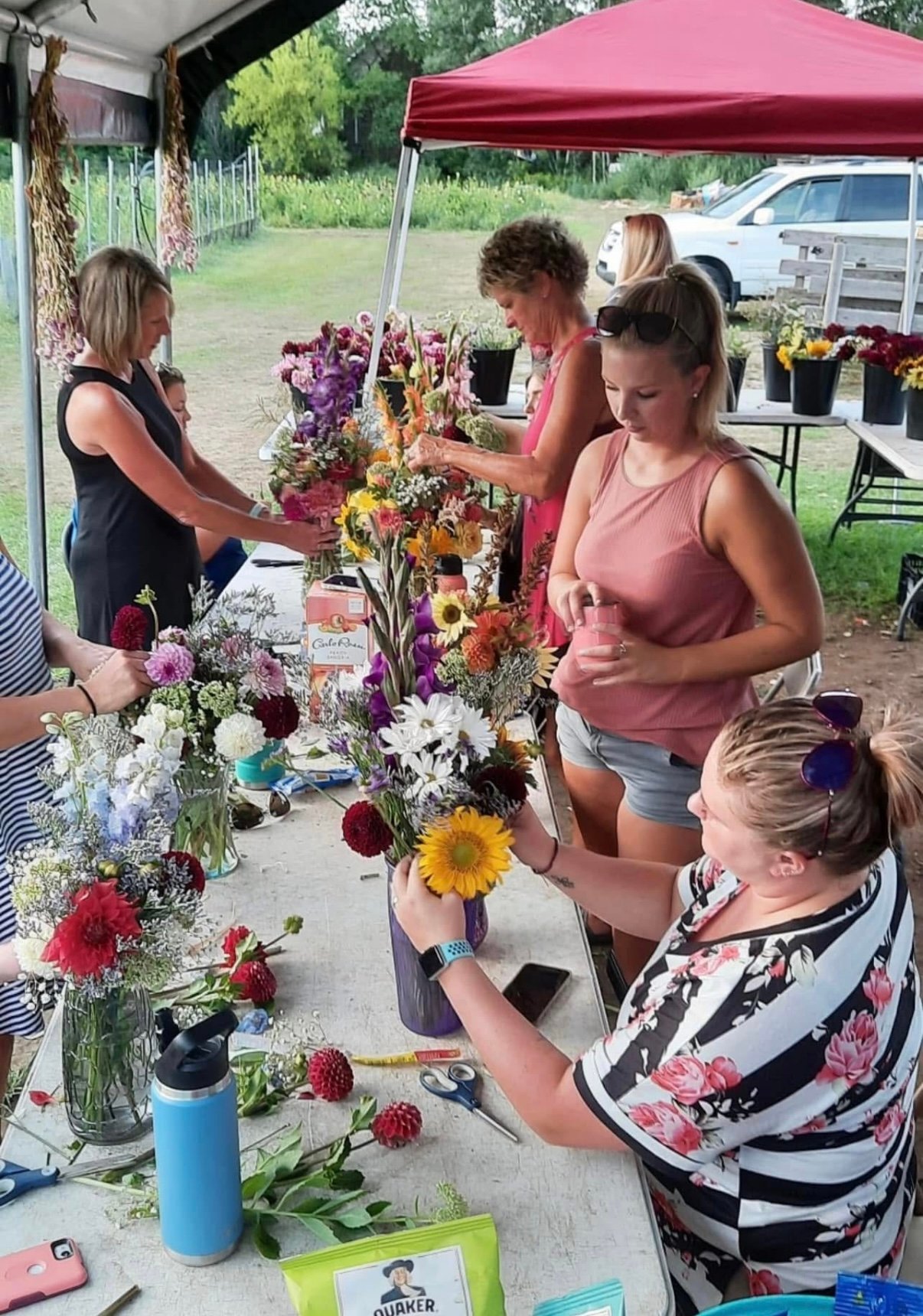 Includes all required materials & instructions. – Vases, Scissors/Clippers, Water, Gloves & an assortment of fresh flowers picked right from our gardens!