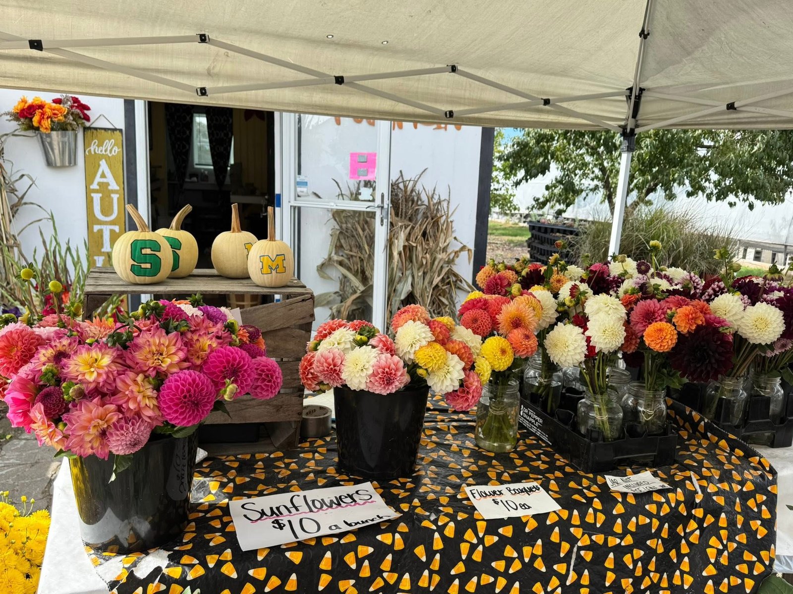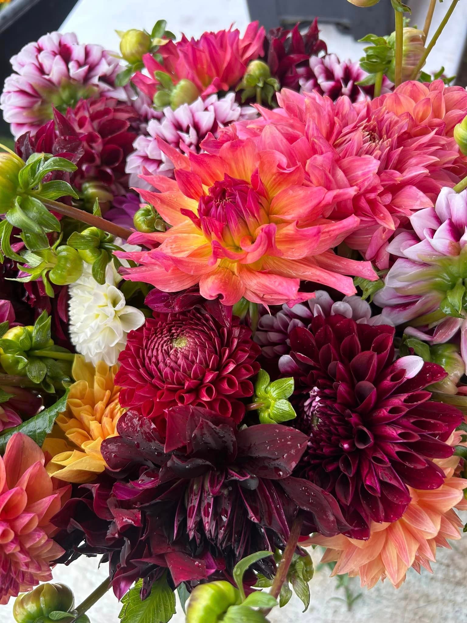 Marcy and Melissa (The Stille Sisters) grew up on a family farm in Grand Haven, Michigan. In 2015, Marcy fell in love with dahlias and purchased a large lot of Dahlia tubers and Dahlia Acres was born. The lot included a diverse collection of colors and shapes from the intricate geometric beauty of the “Jessie Pom Pom”, to the gorgeous feathery look of the “Hot Pink Hottie”. Marcy has always grown vegetables and flowers and owns and manages the farm. Melissa has an art degree from Grand Valley State University and is an art teacher in Norton Shores, Michigan. Melissa provides marketing and event planning for the farm. Together they host many “Design Workshops” that allow social and professional groups to come to Dahlia Acres for a fun flower arranging event. These gatherings can be focused on creating flower arrangements or seasonal decor from July through December. Folks who attend these events go home with a beautiful display of natural components that they made themselves.
